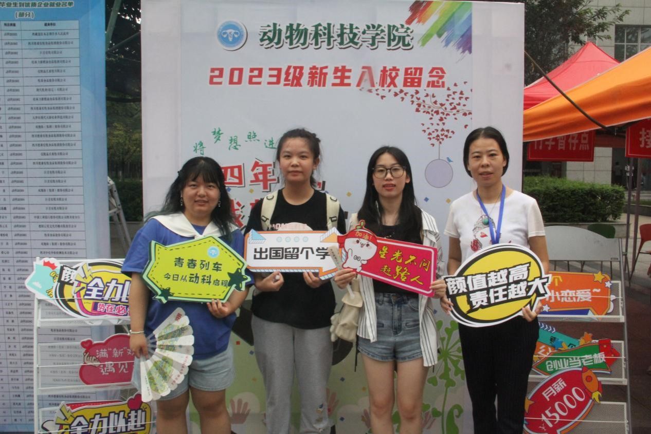 迎新工作中,还有一支在背后默默付出的班主任队伍,时时关心同学,刻刻为同学着想。水产202301班班主任张慧慧,也是动科201902班班主任,作为学工战线的“老同志”,迎来送往是常态,这次她也习以为常地进行着“双迎新”,既迎接水产202301班萌新,也迎接原来本科班留校升学的研究生。2023级动科硕士研究生王雨菲说:“慧慧姐,看到展牌上我们的名字好激动,熟悉的小目标又让我想起了四年前,我们还要再留个影。”